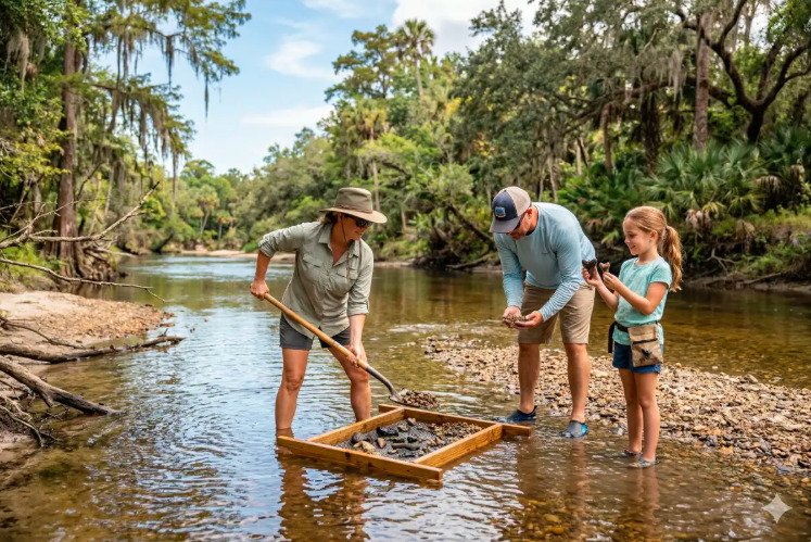 Timing is everything. Fossil hunting is a dry season activity (typically late October through May). When the river level is low (below 5-6 feet at the Zolfo Springs gauge), the gravel bars become accessible. During the summer rainy season, the water is usually too high and fast to dig safely.