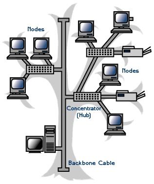 IV. TREE topology: A tree topology combines characteristics of linear bus and star topologies. It consists of groups of star-configured workstations connected to a linear bus backbone cable. Thus, a tree network is a bus network of star networks.
