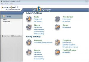 Net Nanny allows you to set both Admin and Default user settings in the Admin Panel. The Settings allow you to configure Profile, Filtering, Time Controls and Games usability, but also more specific details regarding Family options like Passwords, Exceptions, Reports and Email Notifications.