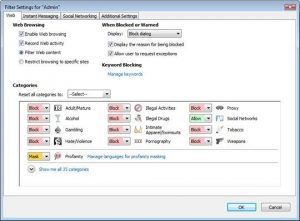 For the Admin user you can configure the behavior for Web, Instant Message, Social Networking and Additional Settings. You may choose which content categories to block or allow, and whether Web activity should be blocked or not.