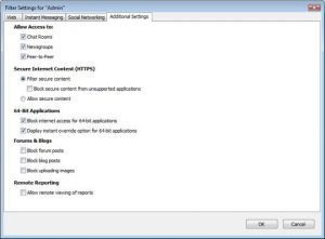 From the Admin Panel you can control access to chat rooms, newsgroups or peer-to-peer sites, but also to https sites, 64-bit applications and blog or forum posting.