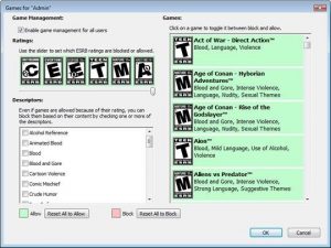 For gaming management you can block or allow any of the installed games on your machine, either by their names or by their ratings. You may easily block all access to games with a single click.